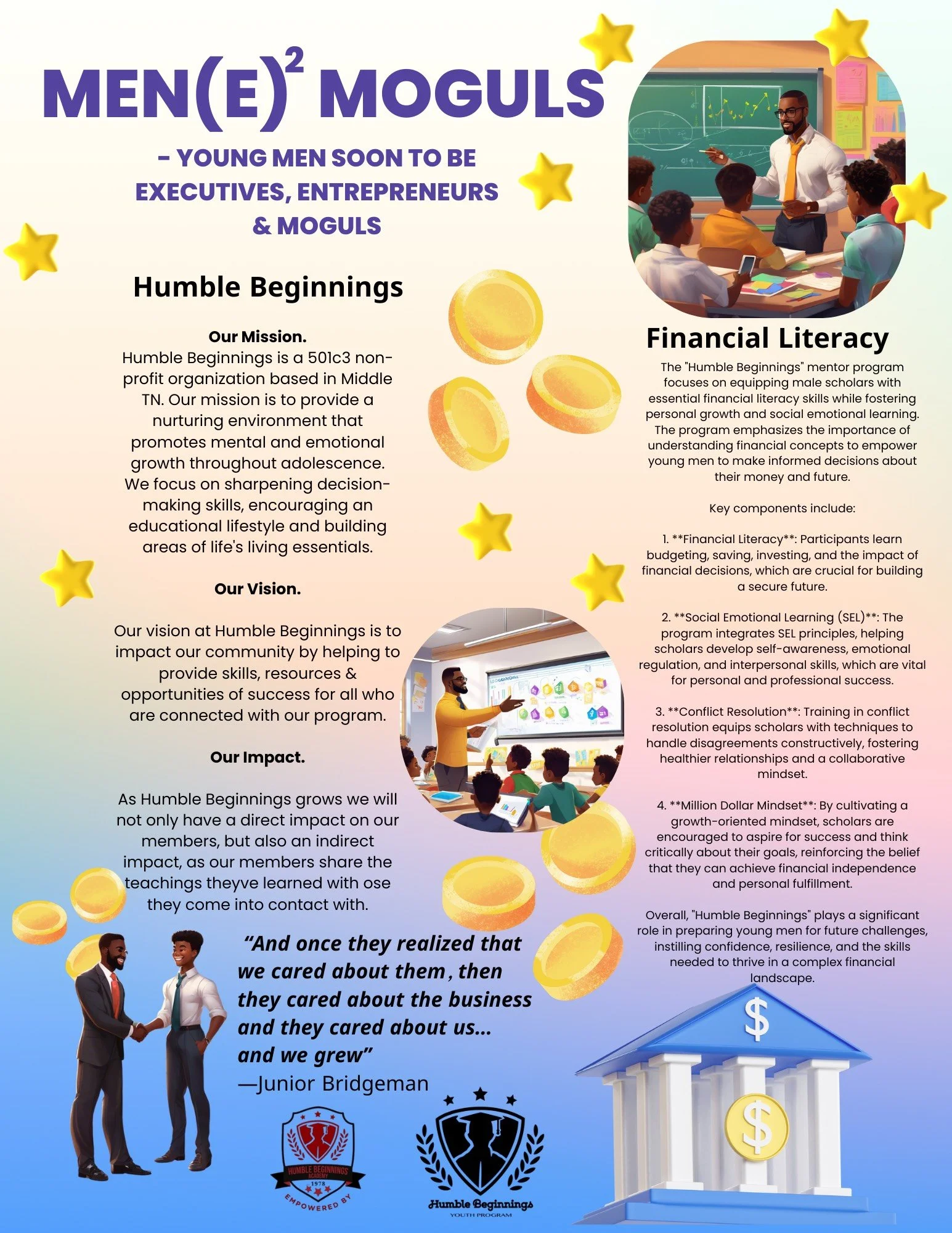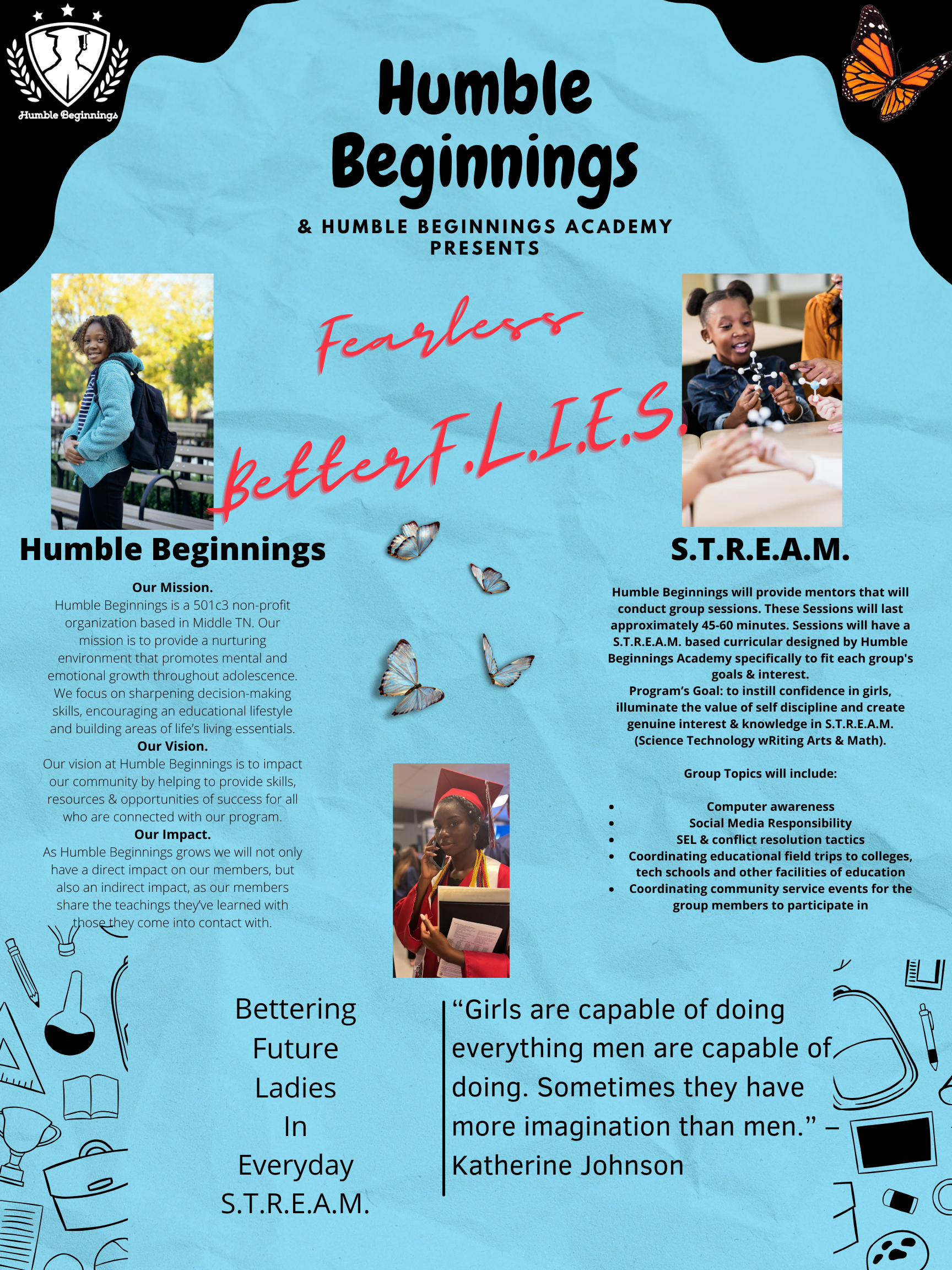 Humble Beginnings partners with schools to provide trained mentors through its BetterF.L.I.E.S. and Men(e)² Moguls daytime mentoring programs. Our mentors deliver structured, in-school experiences that integrate S.T.R.E.A.M. enrichment, financial literacy, social-emotional learning, and leadership development—supporting student engagement, positive behavior, and whole-child academic success.